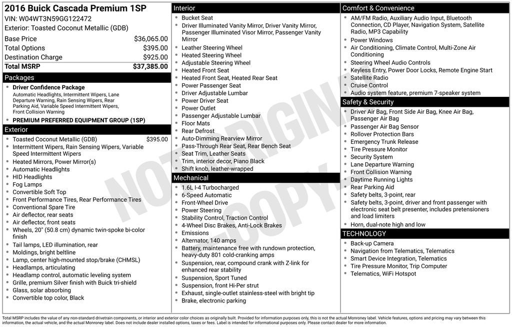 CARFAX One-Owner. Toasted Coconut Metallic 2016 Buick Cascada 2D Convertible Premium 1.6L 4-Cylinder 20/27 City/Highway MPG 6-Speed Automatic Electronic with Overdrive FWD