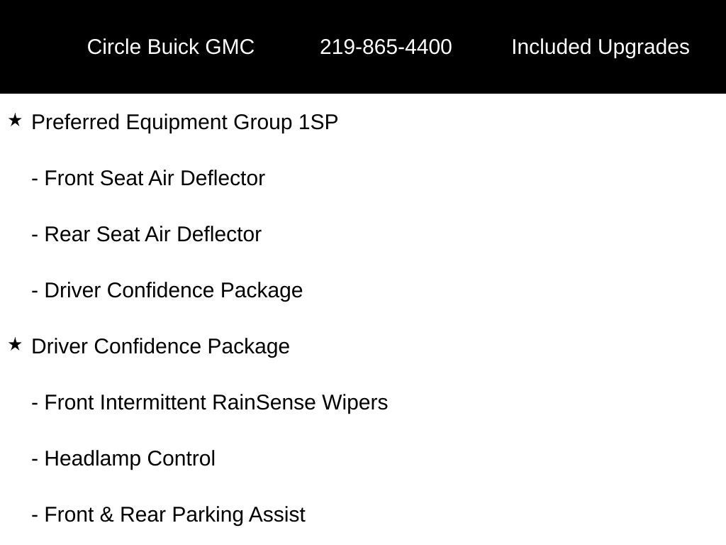 Driver Confidence Package, Forward Collision Alert, Front & Rear Parking Assist, Front Intermittent RainSense Wipers, Front Seat Air Deflector, Headlamp Control, Lane Departure Warning System, Preferred Equipment Group 1SP, Rear Seat Air Deflector.