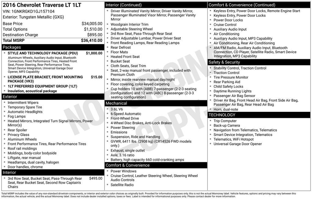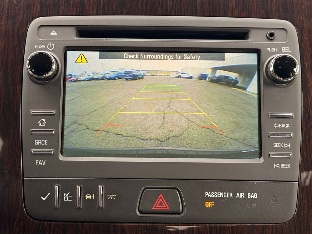 Front License Plate Bracket Mounting Package, Preferred Equipment Group 1LT (8-Way Power Driver Seat w/Power Lumbar, Bluetooth® For Phone, Body-Color Bodyside Moldings, Body-Color Heated Power-Adjustable Outside Mirrors, Enhanced Driver Information Center, Front Fog Lamps, Frontal & Side-Impact Airbags, Interior Wood Grain Center Stack & Interior Trim, Leather-Wrapped Steering Wheel, Rear Park Assist, Remote Vehicle Start, and Standard Speaker System), Style & Technology Package (Heated Driver & Front Passenger Seats, Radio: Chevrolet MyLink AM/FM Stereo w/CD Player, SiriusXM Satellite Radio, Universal Home Remote, Variable Effort Power Steering, and Wheels: 20 x 7.5 Painted Aluminum (4)), 18 x 7.5 Machined Aluminum Wheels, 3.16 Axle Ratio, 3rd row seats: split-bench, 4-Wheel Disc Brakes, 6 Speakers, 7-Passenger Seating (2-2-3 Seating Configuration), 8-Passenger Seating (2-3-3 Seating Configuration), ABS brakes, Air Conditioning, Alloy wheels, AM/FM radio: SiriusXM, Bodyside moldings, Brake assist, Bumpers: body-color, CD player, Compass, Delay-off headlights, Driver door bin, Driver vanity mirror, Dual front impact airbags, Dual front side impact airbags, Electronic Stability Control, Emergency communication system: OnStar, Exterior Parking Camera Rear, Four wheel independent suspension, Front anti-roll bar, Front Bucket Seats, Front Center Armrest w/Storage, Front fog lights, Front reading lights, Fully automatic headlights, Heated door mirrors, Illuminated entry, Low tire pressure warning, Occupant sensing airbag, Outside temperature display, Overhead airbag, Panic alarm, Passenger door bin, Passenger vanity mirror, Power door mirrors, Power driver seat, Power steering, Power windows, Premium Cloth Seat Trim, Radio data system, Radio: Color Touch AM/FM/SiriusXM/CD Player, Rear air conditioning, Rear anti-roll bar, Rear reading lights, Rear seat center armrest, Rear window defroster, Rear window wiper, Remote keyless entry, Roof rack: rails only, Security system, Speed control, Split folding rear seat, Spoiler, Steering wheel mounted audio controls, Tachometer, Telescoping steering wheel, Tilt steering wheel, Traction control, Trip computer, Turn signal indicator mirrors, Variably intermittent wipers, and Voltmeter.