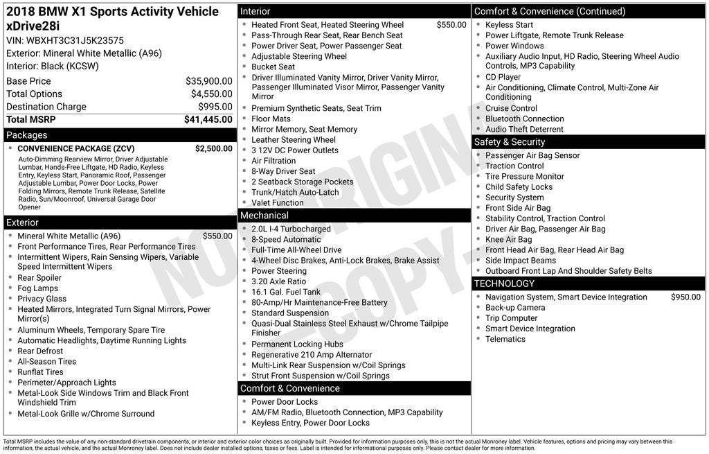 Clean CARFAX. White Metallic 2018 BMW X1 4D Sport Utility xDrive28i 2.0L 4-Cylinder DOHC 16V TwinPower Turbo 22/31 City/Highway MPG 8-Speed Automatic AWD