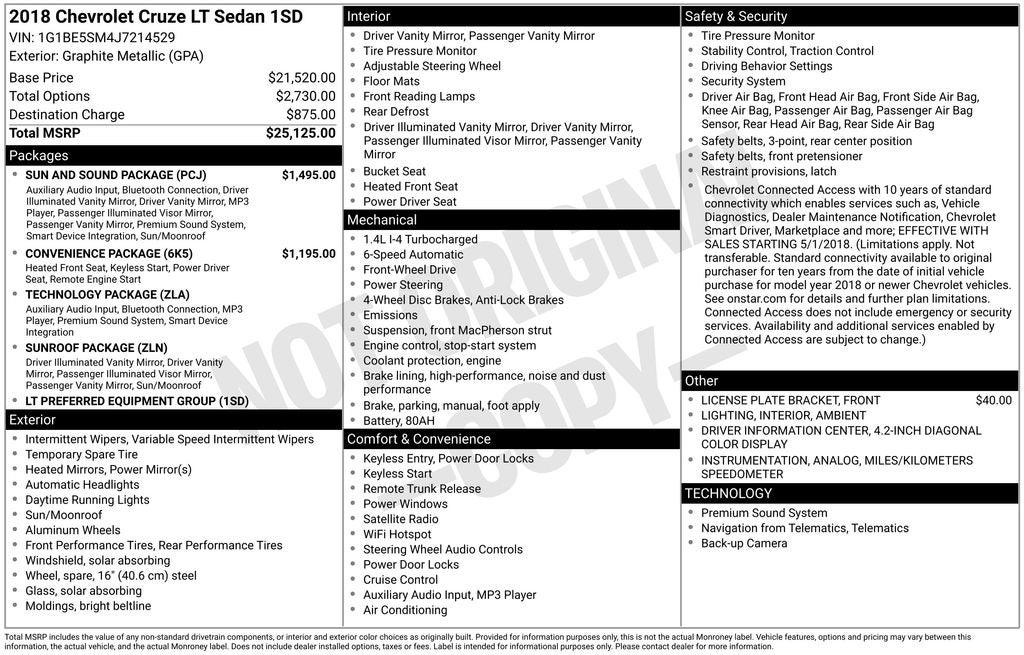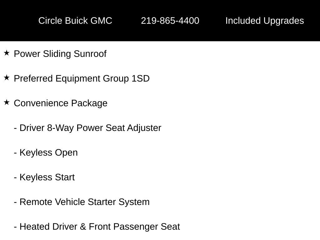 4.2 Diagonal Color Display Driver Info Center, Analog Miles/Kilometers Speedometer, Bose Premium 9-Speaker System, Convenience Package, Driver 8-Way Power Seat Adjuster, Driver/Front Passenger Illuminated Vanity Mirrors, Heated Driver & Front Passenger Seat, Interior Ambient Lighting, Keyless Open, Keyless Start, Power Sliding Sunroof, Preferred Equipment Group 1SD, Radio: AM/FM Chevrolet MyLink w/8 Touch-Screen, Remote Vehicle Starter System, Sun & Sound Package, Sunroof Package, Technology Package.