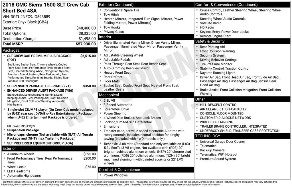 ** Cooled Seats, 8-Speed Automatic with Overdrive, 4WD, Jet Black Leather, 10-Way Power Driver's Seat Adjuster, 110-Volt AC Power Outlet, 150 Amp Alternator, 1st & 2nd Row Color-Keyed Carpeted Floor Mats, 2-Speed Active Electronic AutoTrac Transfer Case, 20 x 9 Chrome Clad Aluminum Wheels, 4.2 Diagonal Color Display Driver Info Center, 6-Speaker Audio System, 6 Rectangular Chromed Tubular Assist Steps, Auto-Dimming Inside Rear-View Mirror, Auxiliary External Transmission Oil Cooler, Bose Speaker System, Chrome Bodyside Moldings, Chrome Door Handles, Chrome Mirror Caps, Color-Keyed Carpeting, Deep-Tinted Glass, Driver & Front Passenger Illuminated Vanity Mirrors, Dual-Zone Automatic Climate Control, Electric Rear-Window Defogger, Enhanced Driver Alert Package, EZ Lift & Lower Tailgate, Floor Mounted Console, Forward Collision Alert, Front Frame-Mounted Black Recovery Hooks, Front Full Feature Power Reclining Bucket Seats, GMC 4G LTE, GMC Connected Access, HD Radio, Heated & Ventilated Front Bucket Seats, Heated Driver & Front Passenger Seats, Heavy-Duty Rear Locking Differential, High-Performance LED Headlamps, Hill Descent Control, Integrated Trailer Brake Controller, IntelliBeam Automatic High Beam On/Off Headlight, Lane Keep Assist, Leather Wrapped Heated Steering Wheel, Leather Wrapped Steering Wheel w/Cruise Controls, LED Cargo Box Lighting, LED Tailamps w/Signature, Low Speed Forward Automatic Braking, Manual Tilt/Telescoping Steering Column, Navigation System, Off-Road Suspension Package, OnStar & GMC Connected Services Capable, Power Adjustable Pedals, Power Folding & Adjustable Heated Outside Mirrors, Power Sliding Rear Window w/Defogger, Power Windows w/Driver Express Up & Down, Preferred Equipment Group 4SA, Radio: AM/FM/GMC Infotainment & Navigation, Rear 60/40 Folding Bench Seat (Folds Up), Rear Wheelhouse Liners, Remote Keyless Entry, Remote Locking Tailgate, Remote Vehicle Starter System, Single Slot CD/MP3 Player, SiriusXM Satellite Radio, SLT Crew Cab Premium Plus Package, Spray-On Pickup Box Bed Liner w/GMC Logo, Steering Wheel Audio Controls, Theft Deterrent System (Unauthorized Entry), Thin Profile LED Fog Lamps, Trailering Equipment, Ultrasonic Front & Rear Park Assist, Universal Home Remote, Wireless Charging.