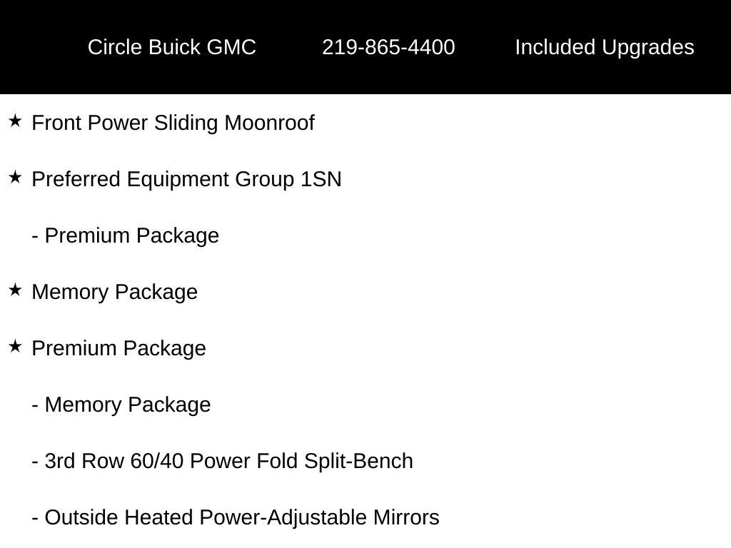 5000lbs Trailering Package (Heavy-Duty Cooling System), Memory Package, Preferred Equipment Group 1SN, Premium Package (Automatic Heated Steering Wheel, Bose Performance-Enhanced 10-Speaker System, Heated 2nd Row Outboard Seats, Heated Driver & Front Passenger Seats, Ventilated Driver & Front Passenger Seats, 120-Volt Power Outlet, 3rd Row 60/40 Power Fold Split-Bench, HD Radio, Outside Heated Power-Adjustable Mirrors, and Power Tilt & Telescopic Steering Column), Buick Interior Protection Package (LPO) (3rd Row All-Weather Floor Mats, All-Weather Cargo Mat (LPO), and All-Weather Floor Mats), FWD, Front Power Sliding Moonroof, 10 Speakers, 18 Painted Aluminum Wheels, 20 Polished Aluminum Wheels, 3.49 Axle Ratio, 3rd row seats: split-bench, 4-Wheel Disc Brakes, 7-Passenger Seating, ABS brakes, Air Conditioning, Alloy wheels, AM/FM radio: SiriusXM, Apple CarPlay/Android Auto, Audio memory, Auto High-beam Headlights, Auto tilt-away steering wheel, Auto-dimming door mirrors, Auto-dimming Rear-View mirror, Automatic temperature control, Brake assist, Bumpers: body-color, Compass, Delay-off headlights, Driver door bin, Driver vanity mirror, Dual front impact airbags, Dual front side impact airbags, Electronic Stability Control, Emergency communication system: OnStar and Buick connected services capable, Four wheel independent suspension, Front anti-roll bar, Front Bucket Seats, Front Center Armrest, Front dual zone A/C, Front reading lights, Fully automatic headlights, Garage door transmitter, Heated door mirrors, Heated front seats, Heated rear seats, Heated steering wheel, Illuminated entry, Leather steering wheel, Low tire pressure warning, Memory seat, Navigation System, Occupant sensing airbag, Outside temperature display, Overhead airbag, Overhead console, Panic alarm, Passenger door bin, Passenger vanity mirror, Perforated Leather-Appointed Seat Trim, Power door mirrors, Power Driver Lumbar Control Seat Adjuster, Power driver seat, Power Liftgate, Power Passenger Lumbar Control Seat Adjuster, Power passenger seat, Power steering, Power windows, Premium audio system: Buick Infotainment System, Radio data system, Radio: Buick Infotainment System AM/FM Stereo, Rear air conditioning, Rear anti-roll bar, Rear reading lights, Rear window defroster, Rear window wiper, Remote keyless entry, Roof rack: rails only, Security system, SiriusXM Radio, Speed control, Speed-sensing steering, Spoiler, Steering wheel memory, Steering wheel mounted audio controls, Tachometer, Telescoping steering wheel, Tilt steering wheel, Traction control, Trip computer, Turn signal indicator mirrors, Variably intermittent wipers, Ventilated front seats, and Voltmeter.