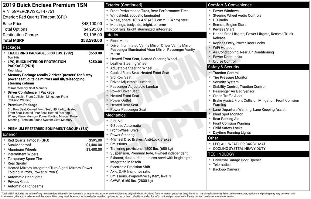 CARFAX One-Owner. Odometer is 36730 miles below market average! Red Quartz Tintcoat 2019 Buick Enclave 4D Sport Utility Premium Group 3.6L V6 SIDI VVT 18/26 City/Highway MPG 9-Speed Automatic FWD