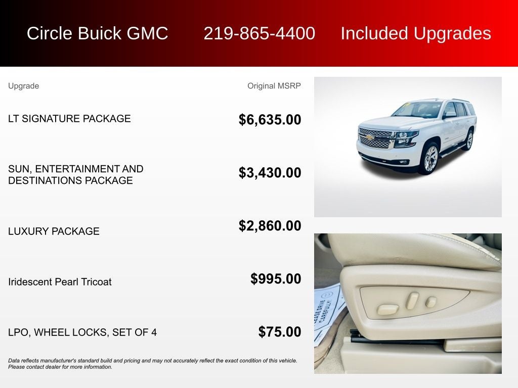 4WD, Cocoa/Dune Leather, 1st & 2nd Row Color-Keyed Carpeted Floor Mats, 2nd Row 60/40 Split-Folding Manual Bench, 2nd Row Pwr Release 60/40 Split Folding Bench Seat, 3rd Row 60/40 Power Fold Split-Bench, 3rd Row Manual 60/40 Split-Folding Fold Flat Bench, 4-Wheel Antilock Disc Brakes w/Brake Assist, 5 12-Volt Auxiliary Power Outlets, Auto-Dimming Inside Rear-View Mirror, Black Assist Steps, Bluetooth® For Phone, Bose Premium 9-Speaker System, Bright Bodyside Moldings, Cargo Net, Chrome Assist Step Kit (LPO), Chrome Recovery Hooks, Color-Keyed Carpeting Floor Covering, Driver Inboard & Front Passenger Airbags, Electronic Cruise Control w/Set & Resume Speed, Enhanced Driver Alert Package (Y86), Extended-Range Remote Keyless Entry, Floor Console, Fog Lamps, Forward Collision Alert, Front & Rear Park Assist, Front Passenger 6-Way Power Seat Adjuster, Grille Insert (LPO), Hands Free Power Liftgate, HD Radio, Heated 2nd Row Seats, Heated Leather Wrapped Steering Wheel, IntelliBeam Headlamps, Lane Change Alert w/Side Blind Zone Alert, Lane Keep Assist w/Lane Departure Warning, Leather-Wrapped Steering Wheel, Low Speed Forward Automatic Braking, LT Signature Package, Luxury Package, Memory Settings, Passive Entry System, Polished Exhaust Tip, Power Liftgate, Power Sunroof, Power Tilt & Telescopic Steering Column w/Memory, Power-Adjustable Accelerator & Brake Pedals, Power-Folding Heated Outside Mirrors, Preferred Equipment Group 1LT, Premium Smooth Ride Suspension Package, Push Button Keyless Start, Radio: Chevrolet Infotainment AM/FM Stereo w/Nav, Rear Cross Traffic Alert, Rear Park Assist w/Audible Warning, Rear Seat Blu-Ray/DVD Entertainment System, Remote Vehicle Start, Roof-Mounted Luggage Rack Side Rails, Single-Slot CD/MP3 Player, SiriusXM NavTraffic, SiriusXM Radio, Sun, Entertainment & Destinations Package, Universal Home Remote, Wheels: 20 x 9 Chrome.