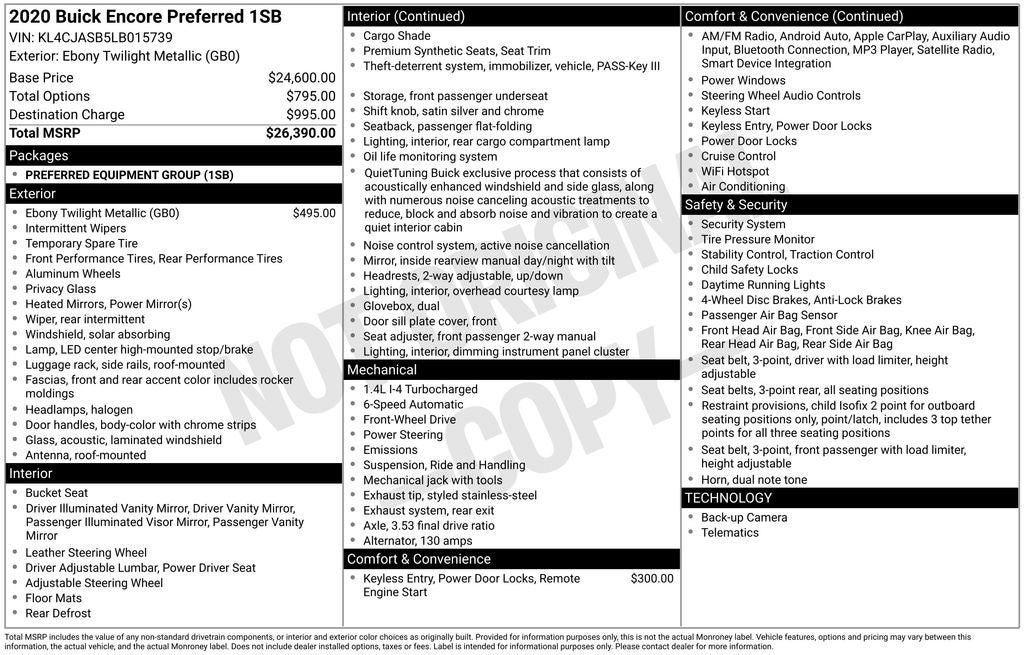 CARFAX One-Owner. Clean CARFAX. Odometer is 12632 miles below market average! Ebony Twilight Metallic 2020 Buick Encore 4D Sport Utility Preferred ECOTEC 1.4L I4 SMPI DOHC Turbocharged VVT 25/30 City/Highway MPG 6-Speed Automatic Electronic with Overdrive FWD