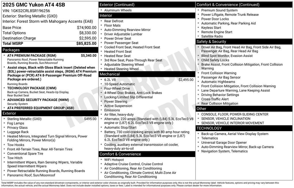 Clean CARFAX. Sterling Metallic 2025 GMC Yukon 4D Sport Utility AT4 EcoTec3 6.2L V8 14/18 City/Highway MPG 10-Speed Automatic with Overdrive 4WD